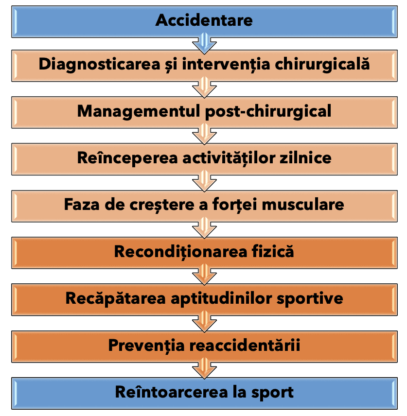 După o accidentare gravă, sportivul are nevoie de un proiect, de un plan și de un conducator care să îl îndrume pe drumul lung al procesului de recuperare și reintegrare în activitatea sportivă. Faza de stabilire a diagnosticului și a curei de tratament, ortopedic sau chirurgical, trebuie să vină la pachet cu un plan de management al întregului program de recuperare.
