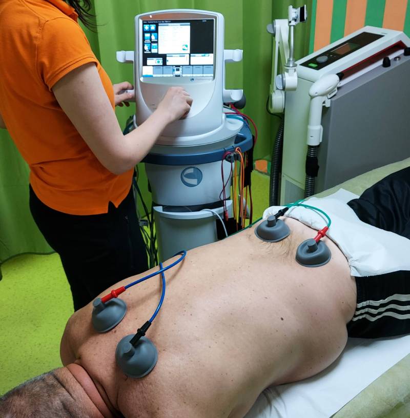 Tratamentul fiziokinetic poate fi alcatuit dintr-o serie de proceduri de electroterapie (curenti interferentiali, TENS, Laser, Tecar) care vor ajuta la managementul durerii, al inflamatiei si in acelasi timp, proceduri precum terapia TECAR vor ajuta si la decontracturarea musculaturii de la nivelul zonei afectate. De asemenea, un procedeu foarte benefic in tratarea durerilor de spate este masajul terapeutic care intervine in diminuarea problemelor de natura musculara. O alta terapie foarte benefica este reprezentata de elongatia vertebrala. Aceasta realizeaza o crestere a spatiului intervertebral ceea ce poate duce la reducerea compresiei ce apare la nivelul nervului.